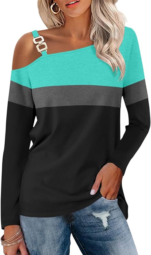 Women's Long Sleeve Tunics Tops Color Block Off Shoulder Tops Casual Shirts