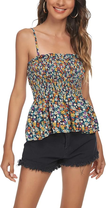 Women's Casual Frill Smocked Cami Tank Tops Floral Shoulder Strap Vest