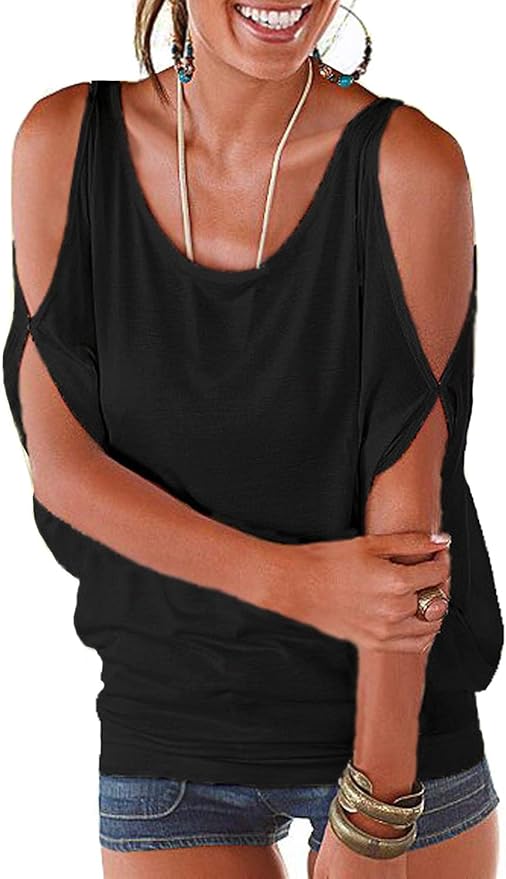 Womens Summer Cold Shoulder Tops Casual Scoop Neck Loose Fit T Shirt