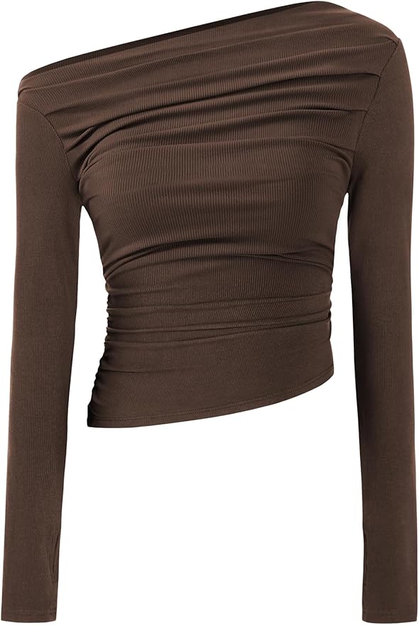 Women's Long Sleeve Off Shoulder Tops Sexy Going Out Slim Fit Knit Asymmetrical Ruched Shirts Y2K Blouses Trendy Outfit