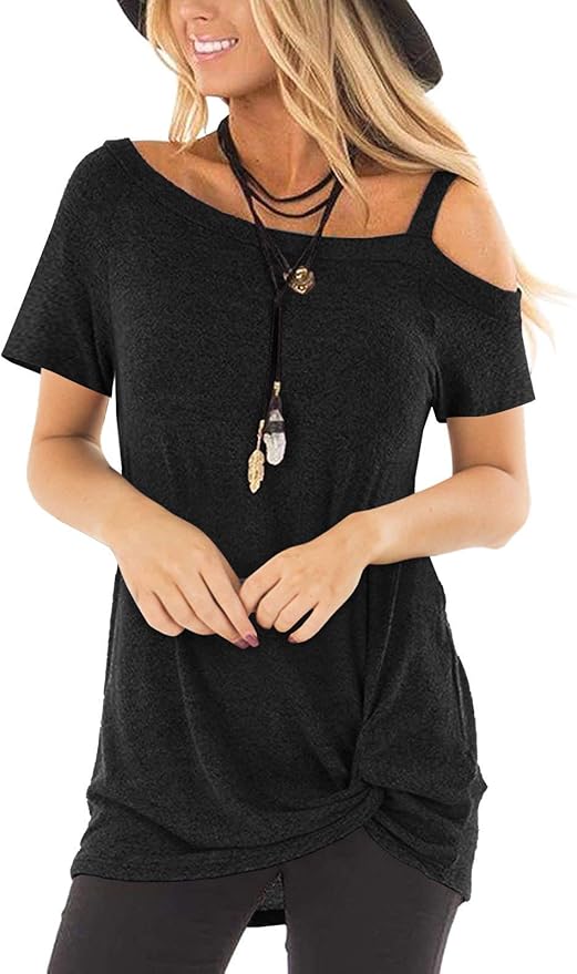 Women Cold Shoulder Tops: Summer Short Sleeve Shirts Casual Twist Knot Blouse T-Shirt S-2XL