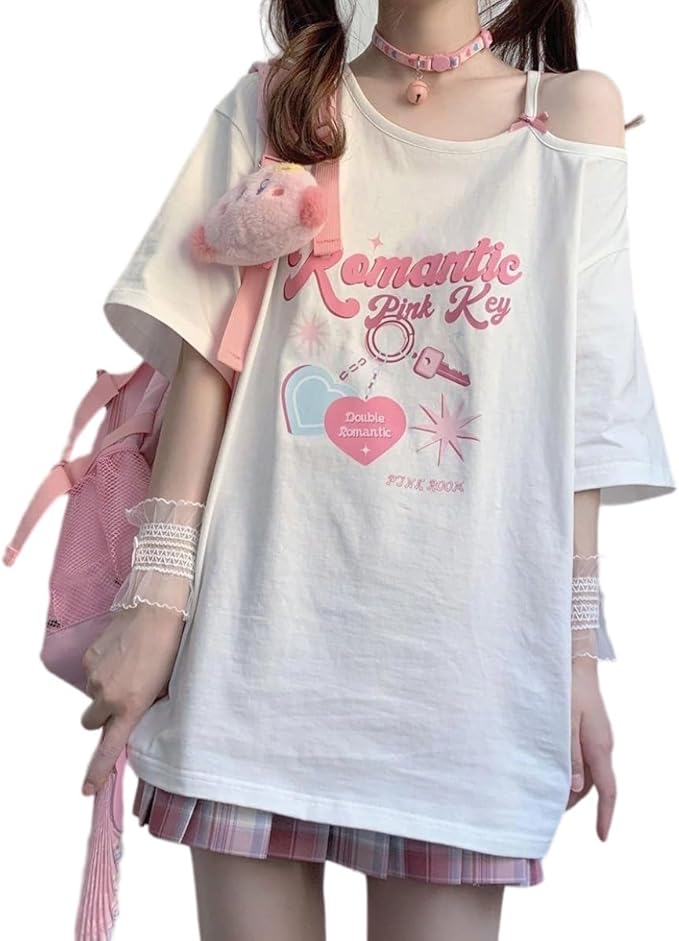 Women Kawaii Off Shoulder T-Shirt Harajuku Sweet Girl White Tops Y2k Aesthetic Cute Graphic Tees Japanese Fashion Shirt
