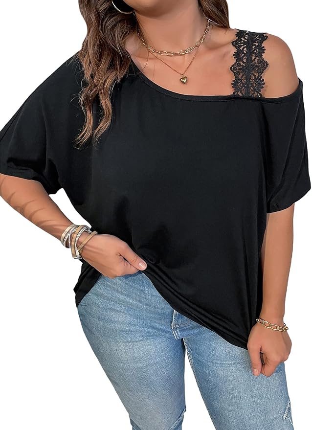 Women's Plus Size Cold Shoulder Contrast Lace Short Sleeve Tee T Shirt Summer Tops