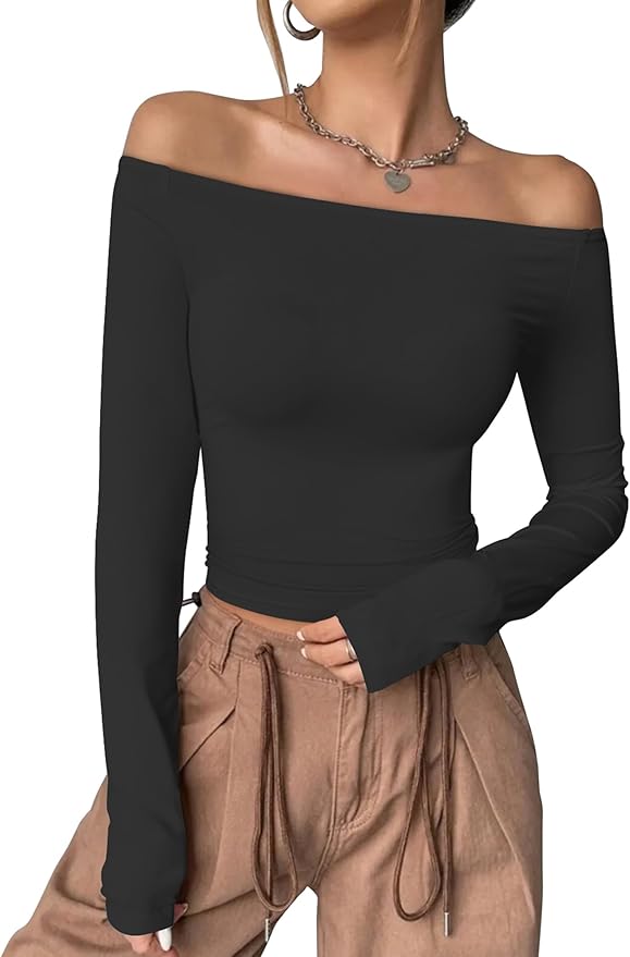 Women Long Sleeve Tops Boat Neck Off Shoulder Shirts Fitted Going Out Y2K Crop Top